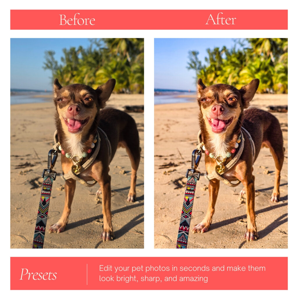 And once you’ve got the photos, you’ll make them shine with the Pet Photography Presets. These professional Lightroom presets are designed especially for pet photography, giving you that warm, glowing, magazine-worthy look in just one tap. Fur looks softer, colors richer, eyes brighter. Your photos finally look as good as your pet.
